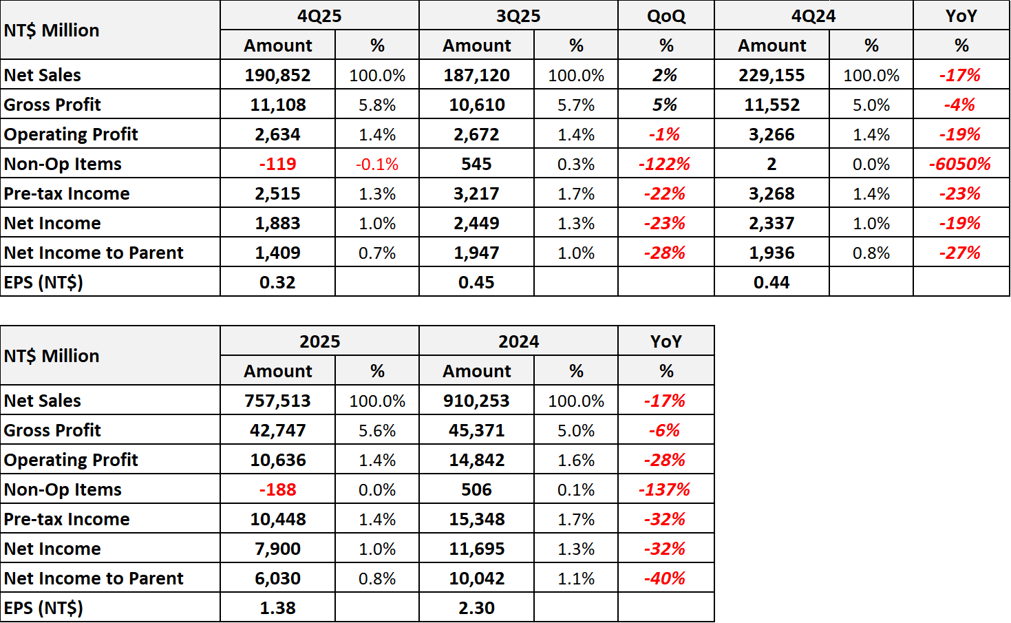 4Q25 consolidated revenue NT$190,852 million, up 2% QoQ, primarily driven by growth in PC products and emerging businesses, particularly server and 5G-related revenue. Supported by ongoing transformation efforts, GM improved to 5.8% in 4Q25, compared to 5.7% in the previous quarter, while OPM remained stable at 1.4%. Due to seasonal factors and ongoing investment in the server business, operating expenses increased QoQ. Consolidated operating profit was NT$2,634 million, down 1% QoQ. Net profit attributable to the parent company was NT$1,409 million, down 28% QoQ. 4Q25 EPS was NT$0.32.