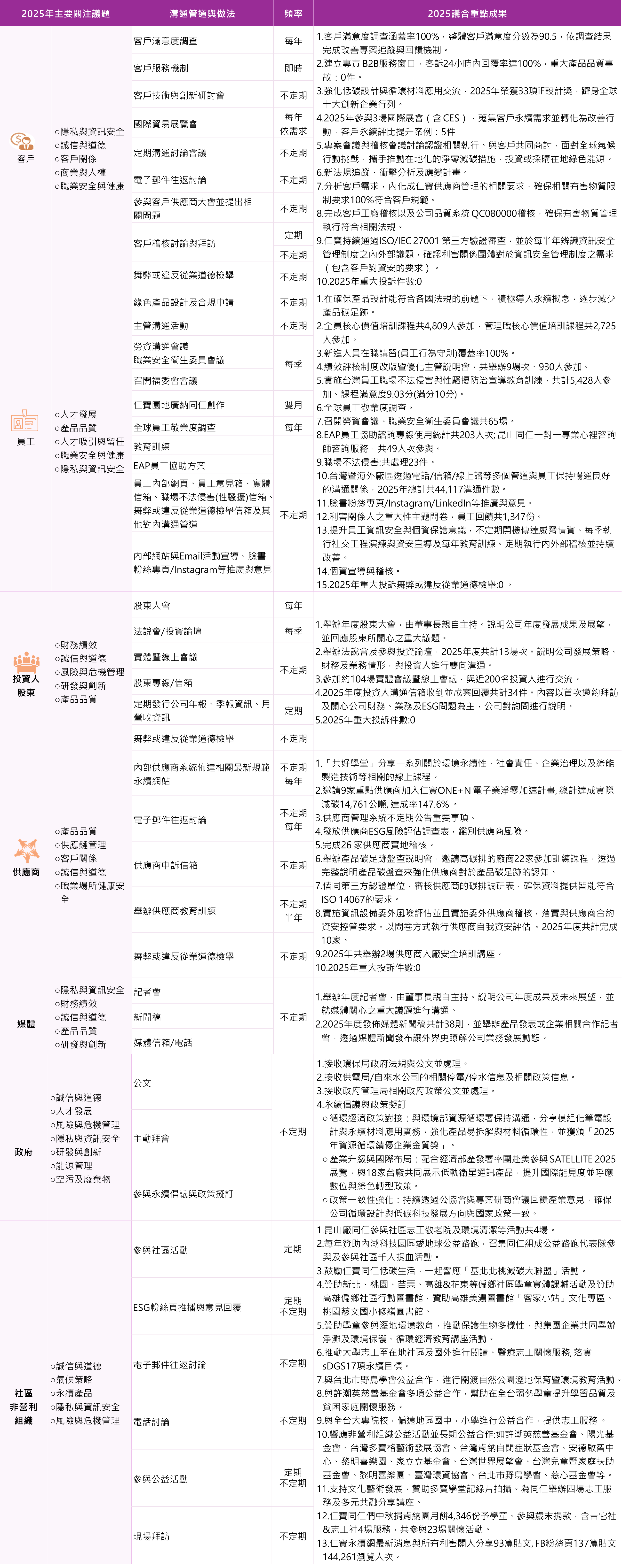 113年度各利害關係人溝通情形如下,並依「永續發展實務守則」及 「公司治理評鑑」之規定辦理,已於114年03月20日向董事會報告。