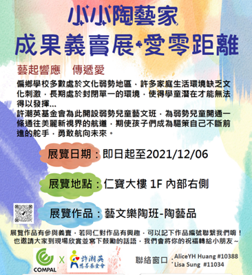 In 2021, we hold the "Little Potters ~ Achievements Charity Fair and Love Zero Distance" public welfare activity to support the social care actions of the Hsu Chauing Social Welfare &Charity Foundation to help the disadvantaged in remote villages and emergency relief, and transfer the disadvantaged children's art created by the Hsu Chauing Social Welfare & Charity Foundation. Wenban's pottery works were exhibited at Compal and sold for charity. All proceeds from the charity sale all donated to Then-Tou Elementary School "Maker Education". A total of 20 colleagues participated in the sponsorship of the event.