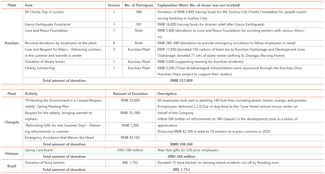 In 2023, Employees at Compal plants participated in volunteer services, emergency assistance, supporting the education and welfare of disadvantaged schoolchildren, taking care of senior citizens, and donation of needed supplies.