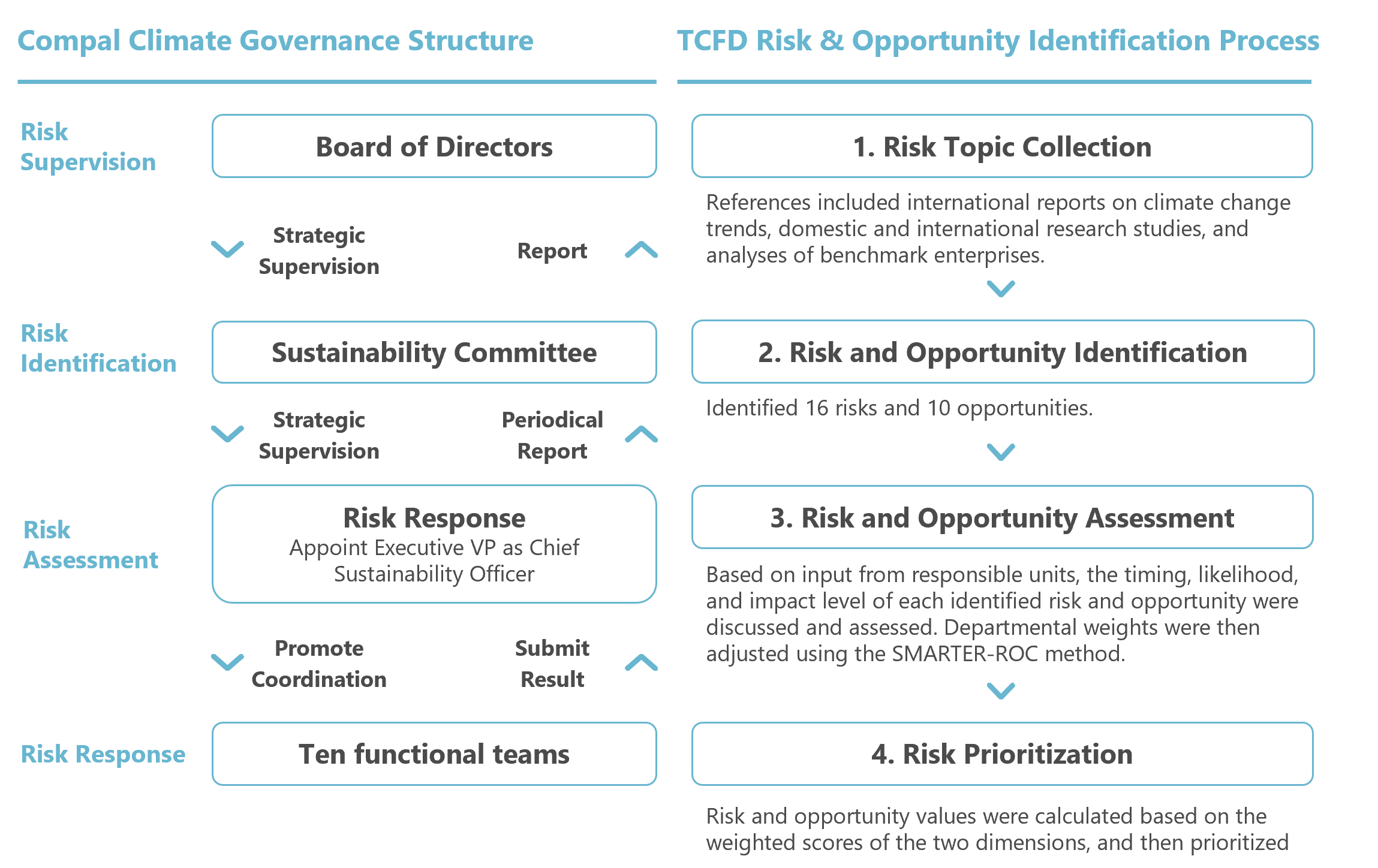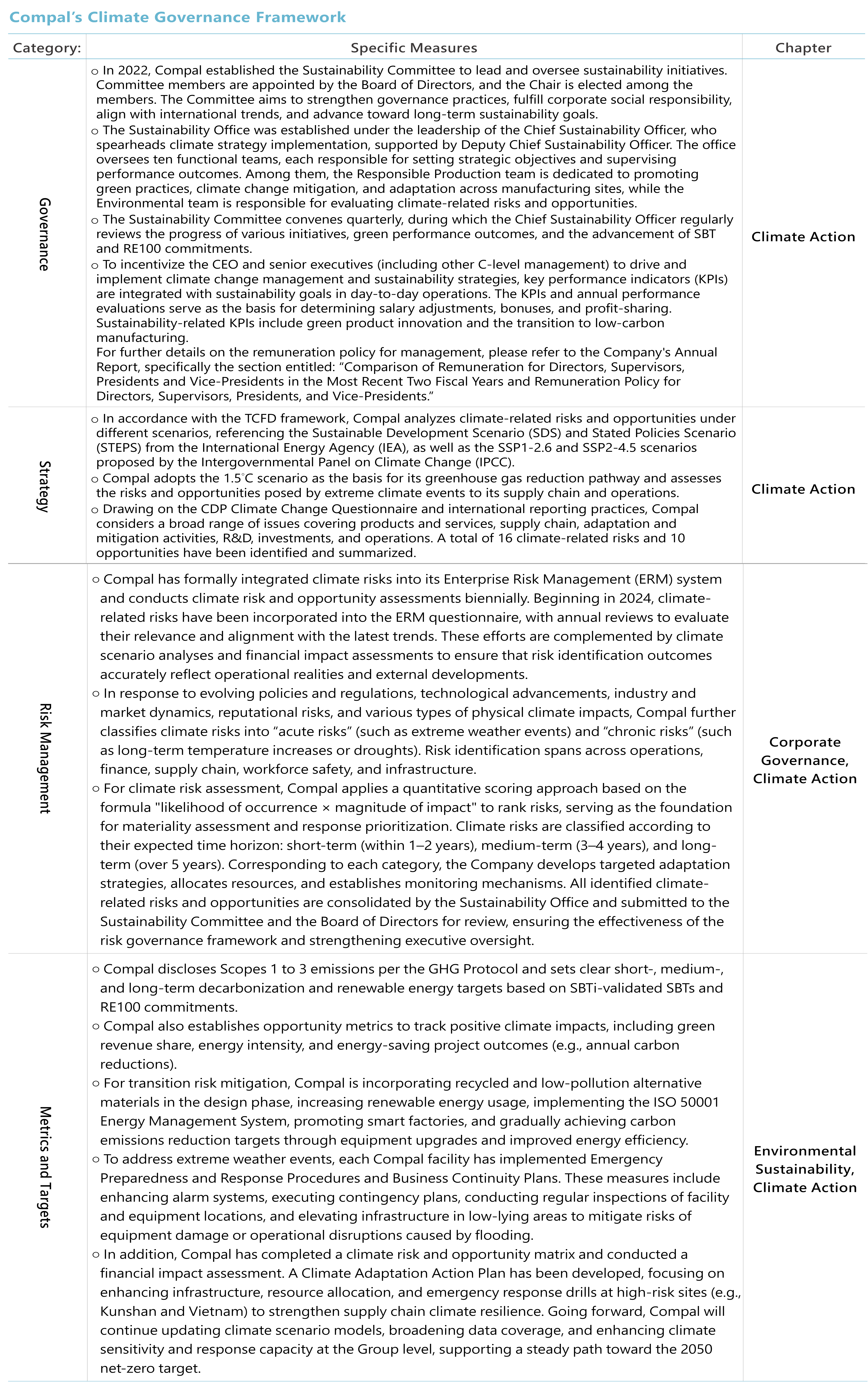 Since 2021, Compal has adopted the four core pillars under the TCFD framework to build its climate governance system, while systematically identifying climate risks and opportunities in line with international trends and investor expectations. Following the IFRS S2 standard released by the International Sustainability Standards Board (ISSB), TCFD principles have been fully integrated into the sustainability disclosure framework, emphasizing consistency, comparability, and decision relevance in disclosures.