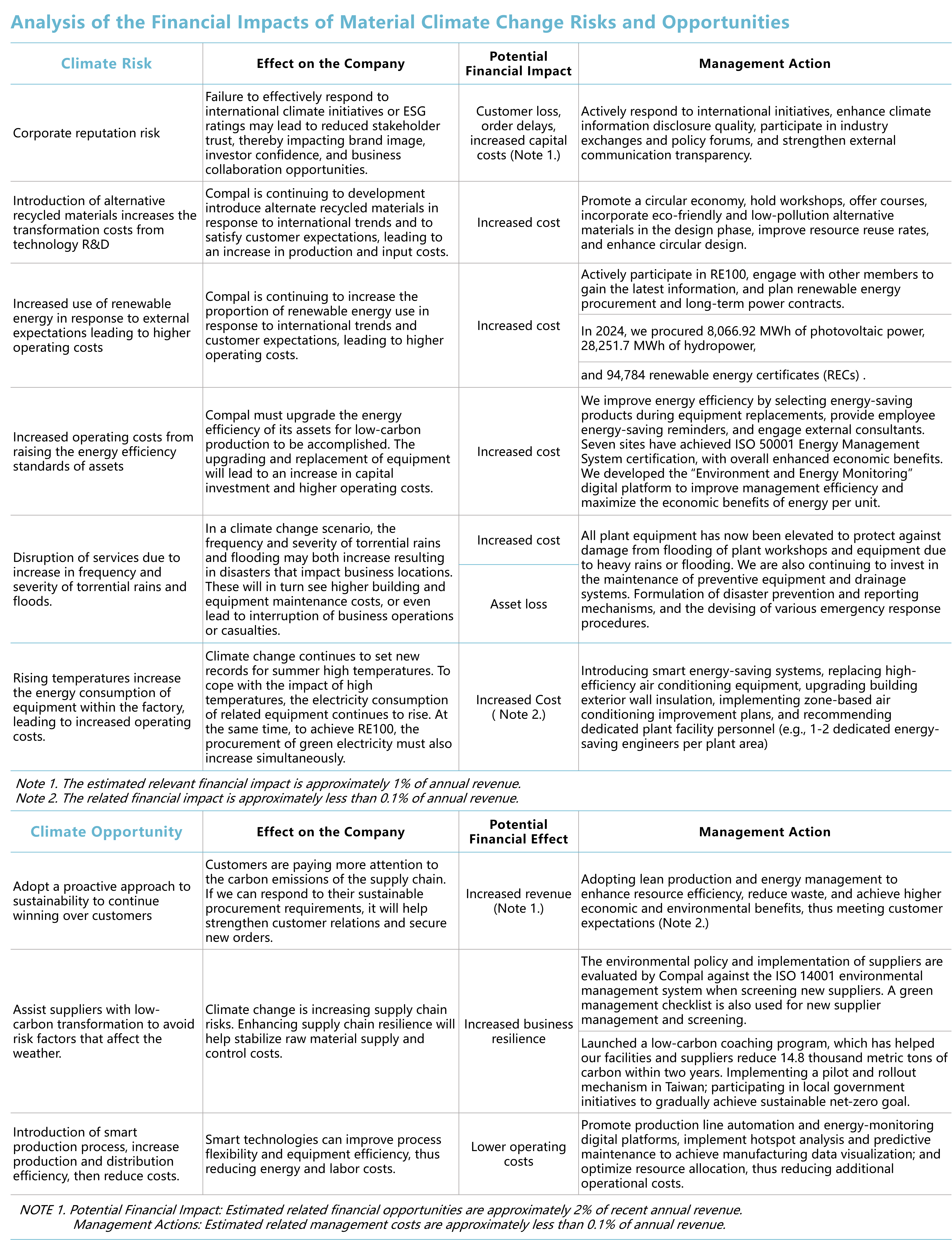 By adhering to the TCFD framework, Compal enhances the group's operational resilience and information transparency. This enables us to respond to the potential impacts of climate change on our strategy, finances, and operations. It also serves as an important basis for future compliance with carbon border taxes, green procurement, and capital market disclosure requirements, while gradually aligning with IFRS requirements.