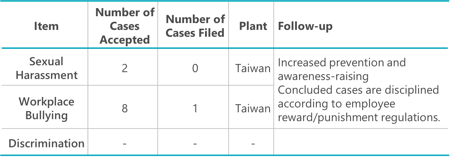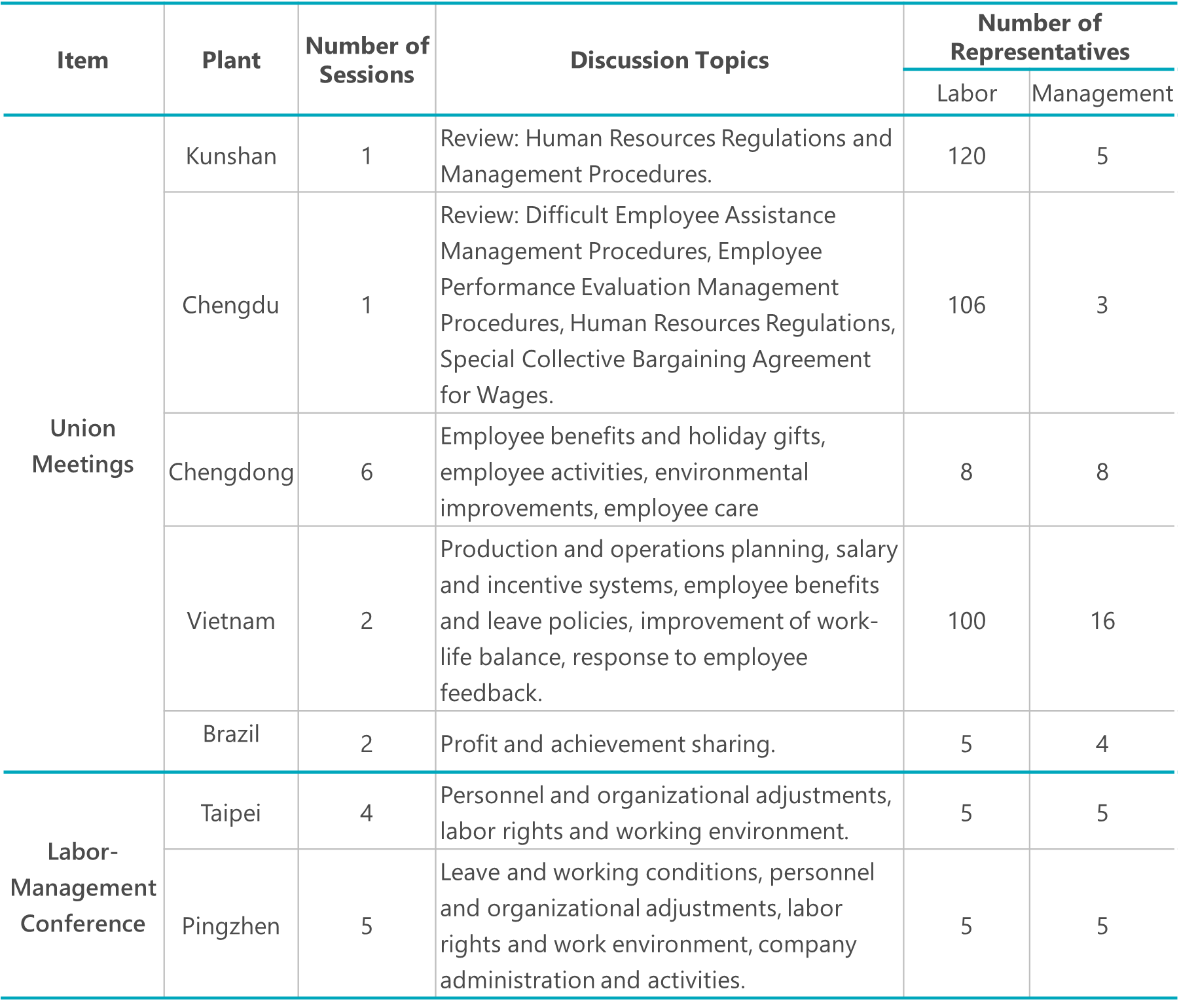 According to the “Procedure Governing Employees’ Freedom of Association and Rights to Collective Bargaining”, some plants have set up labor negotiation units and scheduling negotiation conferences, which are attended by representatives of labor and management to discuss labor disputes, employee welfare, collective contracts and other related matters. Some plants adopt regular audit and review, and e-mail to discuss matters, so there is no regular physical meeting.
