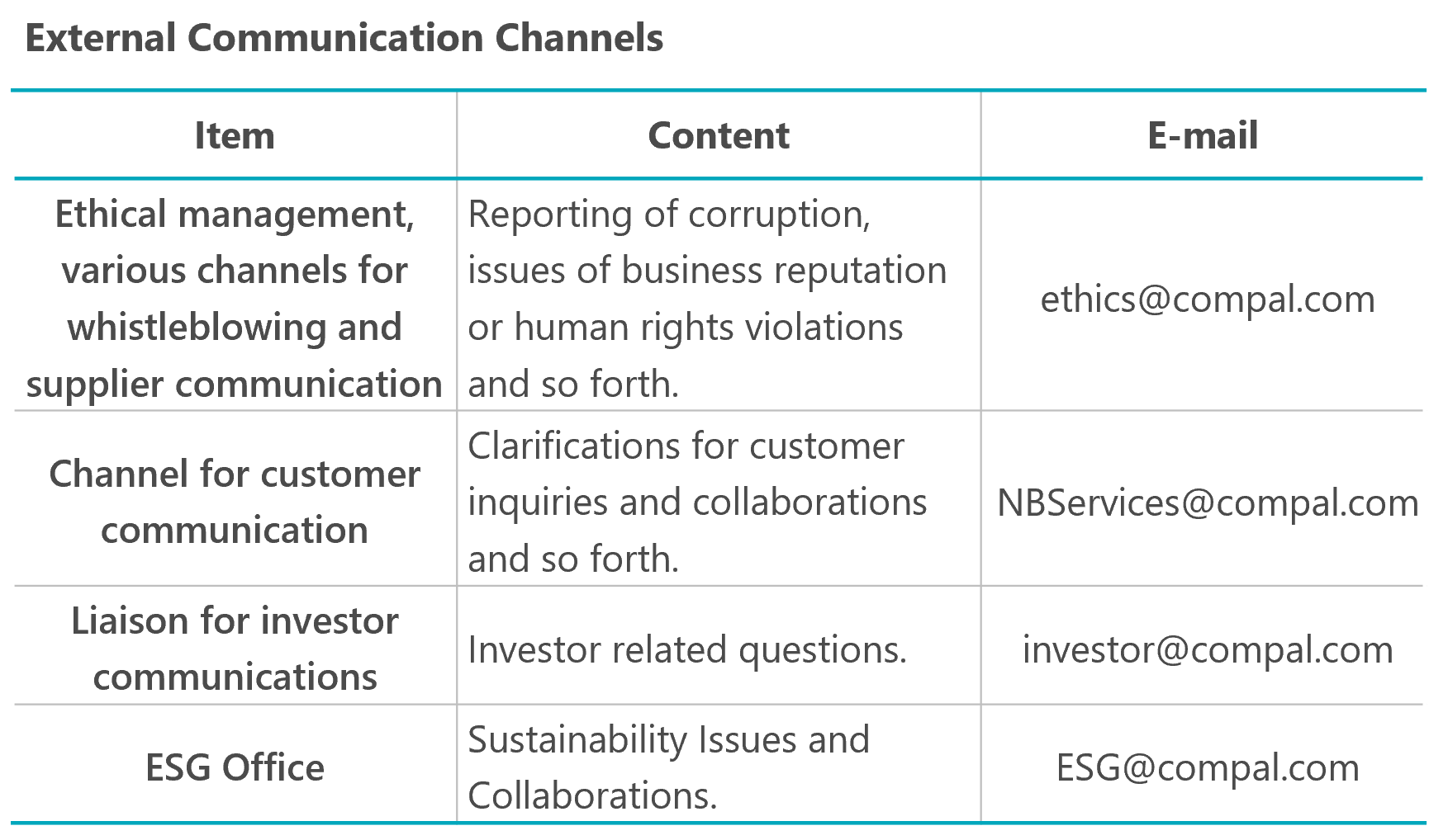 If employCompal values the input and opinions of all stakeholders and we have provided relevant grievance channels and mechanisms for stakeholders to implement relevant verification and handling of all grievances and complaints in the hopes of listening to different opinions. Stakeholders of our company can use the following e-mail to complain or report, whether be named or unnamed, will be accepted.