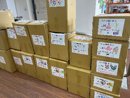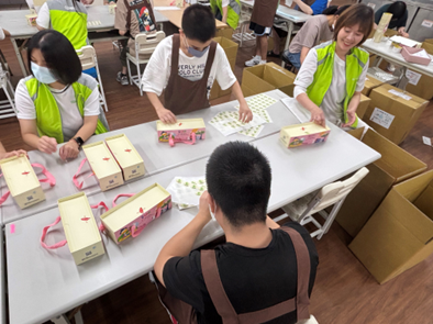 Under the task assignments arranged by the Kanner Garden teachers, Team A and Team B of the COMPAL x Kanner mooncake assembly line were formed. Following the guidance of the Kanner youth and instructors, COMPAL colleagues worked together to assemble the mooncakes, place in the Mid-Autumn blessing cards from COMPAL’s big brothers and big sisters, attach COMPALstickers, and then check quantities and seal each carton according to the number of boxes for each delivery address.