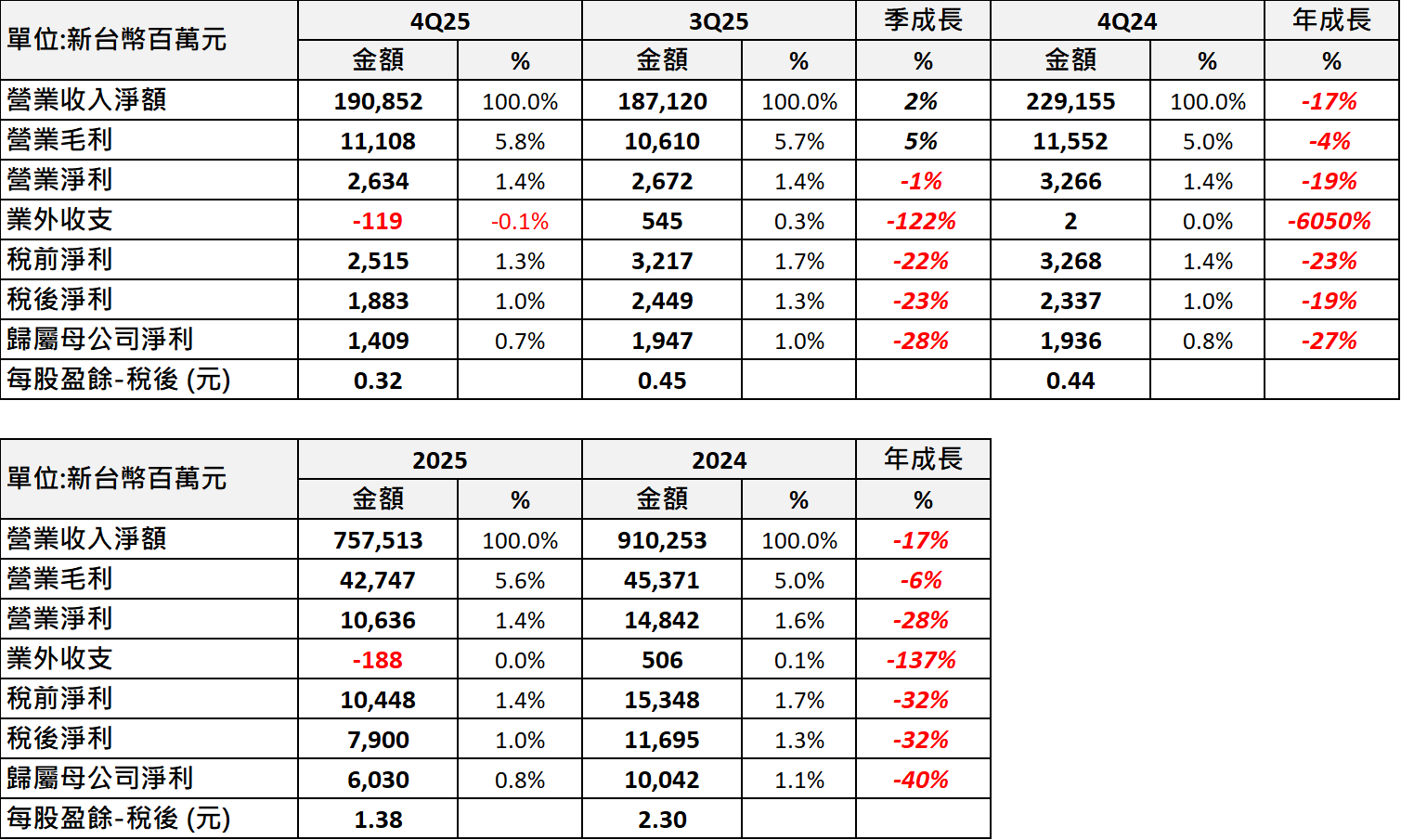 仁寶電腦(股票代號:2324)今日公布2025年度營運成果。全年合併營收為新台幣7,575.13億元,較去年同期減少17%,主因受到全球關稅政策對消費性市場衝擊、市場競爭加劇,以及公司策略性業務調整影響。公司持續推動自動化、營運優化及成本控管,使年度毛利率提升至5.6%,展現營運體質持續改善的成果。2025年為仁寶AI轉型的關鍵元年,積極擴大新事業的研發與投資,相關營收規模尚待顯現,使營運槓桿未能充分發揮,全年營業淨利率為1.4%,合併營業淨利為新台幣106.36億元,年減28%;稅後歸屬母公司業主之淨利為新台幣60.30億元,年減40%;全年每股盈餘為1.38元。本日董事會亦決議通過2025年度盈餘分配案,預計每股配發1.1元現金股利,相當於80%配發率,展現公司持續回饋股東的承諾。